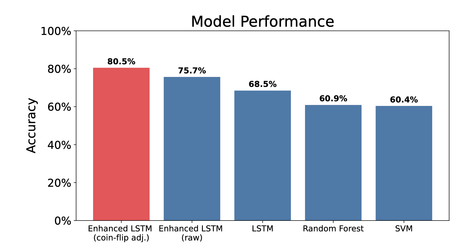 On our historical sample of 1,269 AFL games the system achieves 75.7 percent raw accuracy and an adjusted 80.5 percent on fixtures that are not genuine coin flips. More importantly, it is well calibrated and will say fifty fifty when that is the truth.