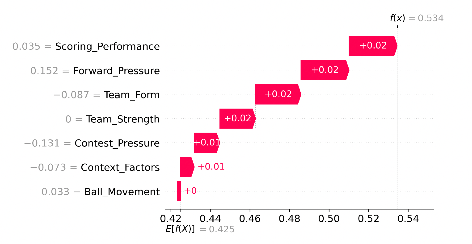 We use SHAP values to make the model’s reasoning transparent. For every prediction, SHAP breaks down how each factor, such as scoring performance, team form, ball movement, or contest pressure, contributes to the final win probability. Positive values push a team’s chances up, while negative values pull them down. This allows coaches and analysts to see not just what the model predicts, but why it thinks that way, using the same language they use to discuss the game.